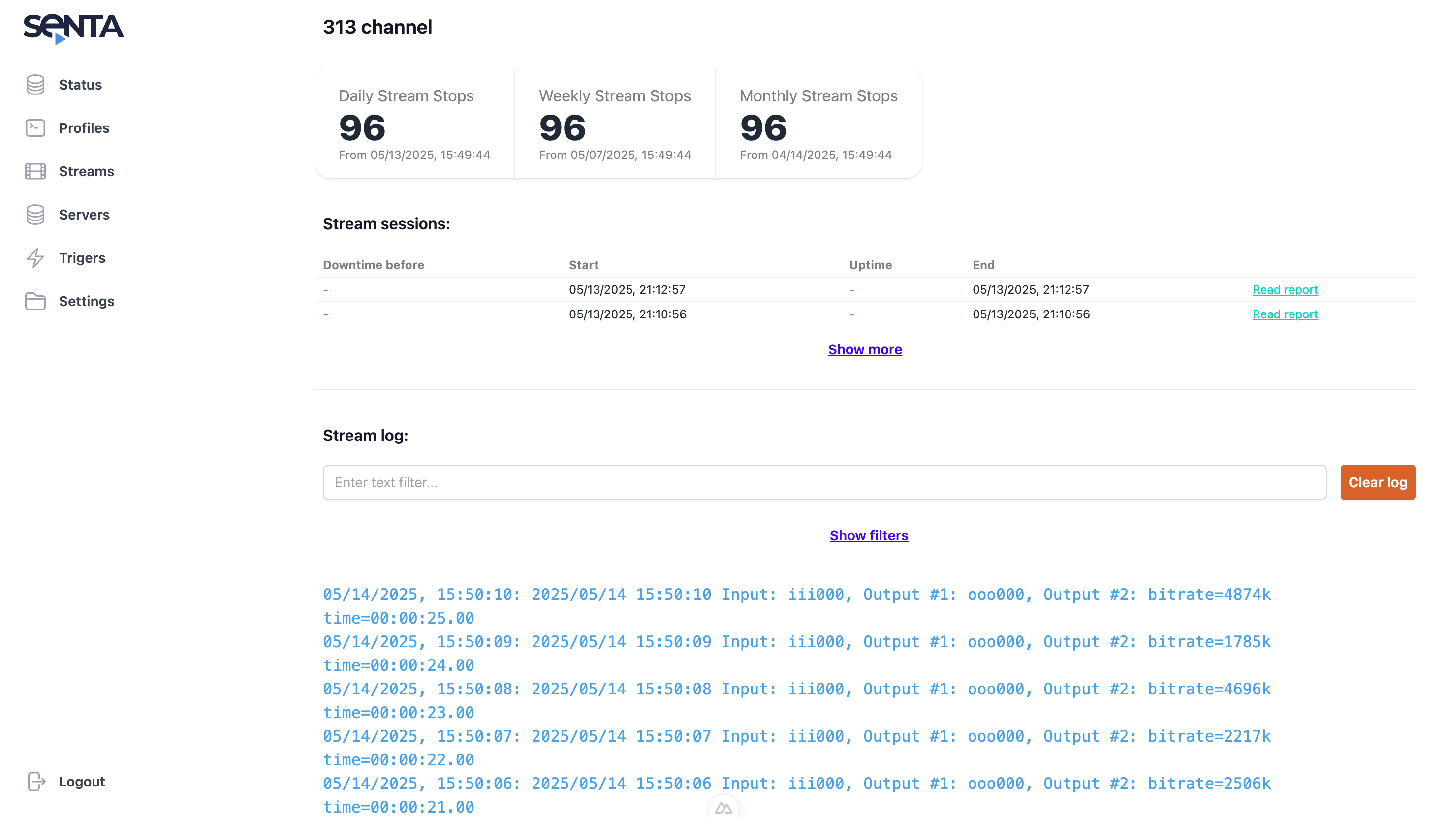 Section titled “Session List”Below is a list of stream sessions. A session is a period of uninterrupted stream operation — from start to stop or crash.